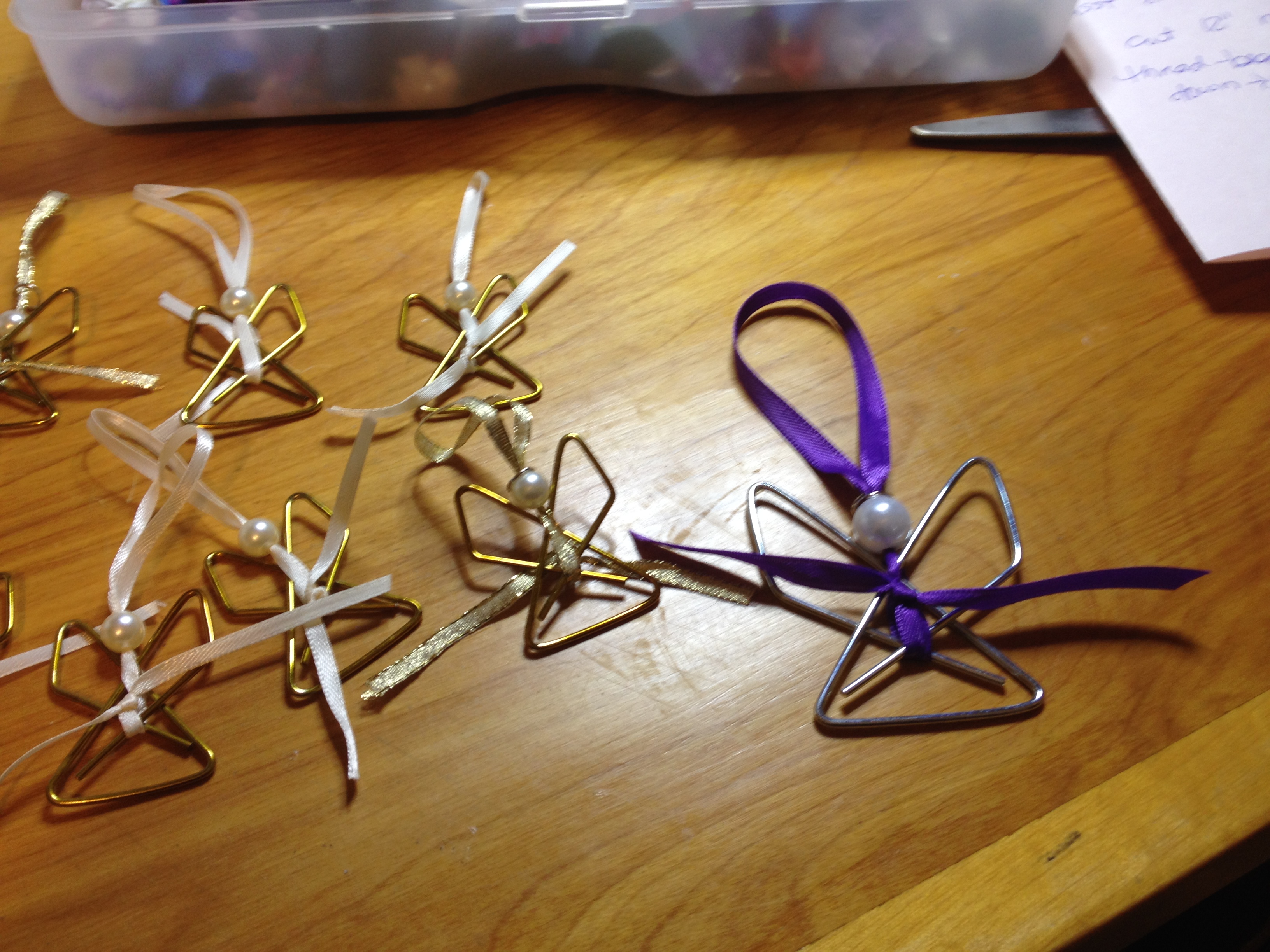 I started by cutting several lengths of ribbon into 12″ pieces.  Next, separating the flowers and leafs from the stems. I set up bowls of each item and worked on these assembly line style. Start by threading a head bead onto the ribbon.  Leave a hanging loop 1-1/2″ long, and go back through the bead again. Tie the ribbon around the middle of the clamp and cut ends on a diagonal. Slip the jump ring for the halo, over the hanging loop.  A little dab of glue will hold it, but I kinda like it to move around a little bit.