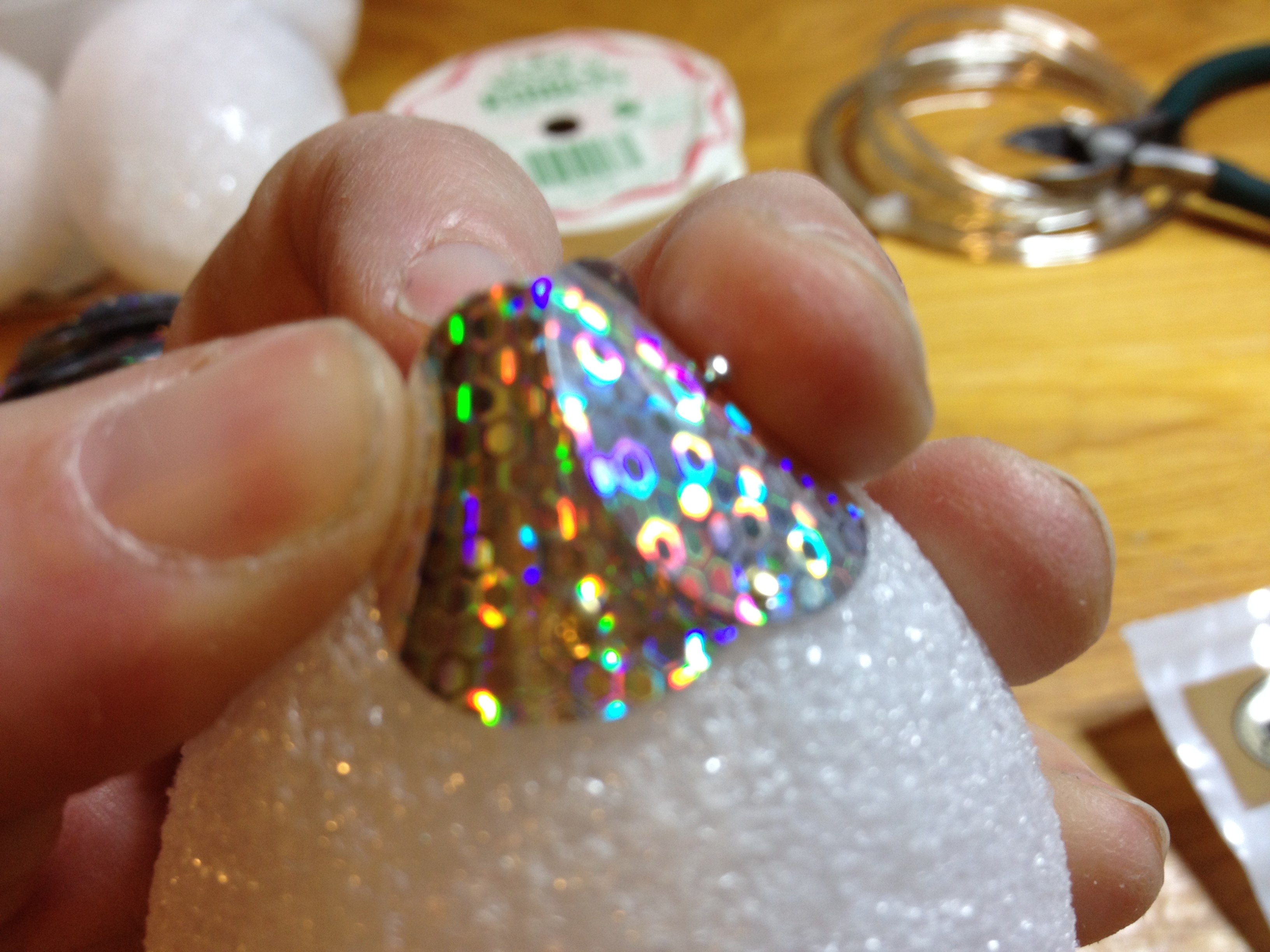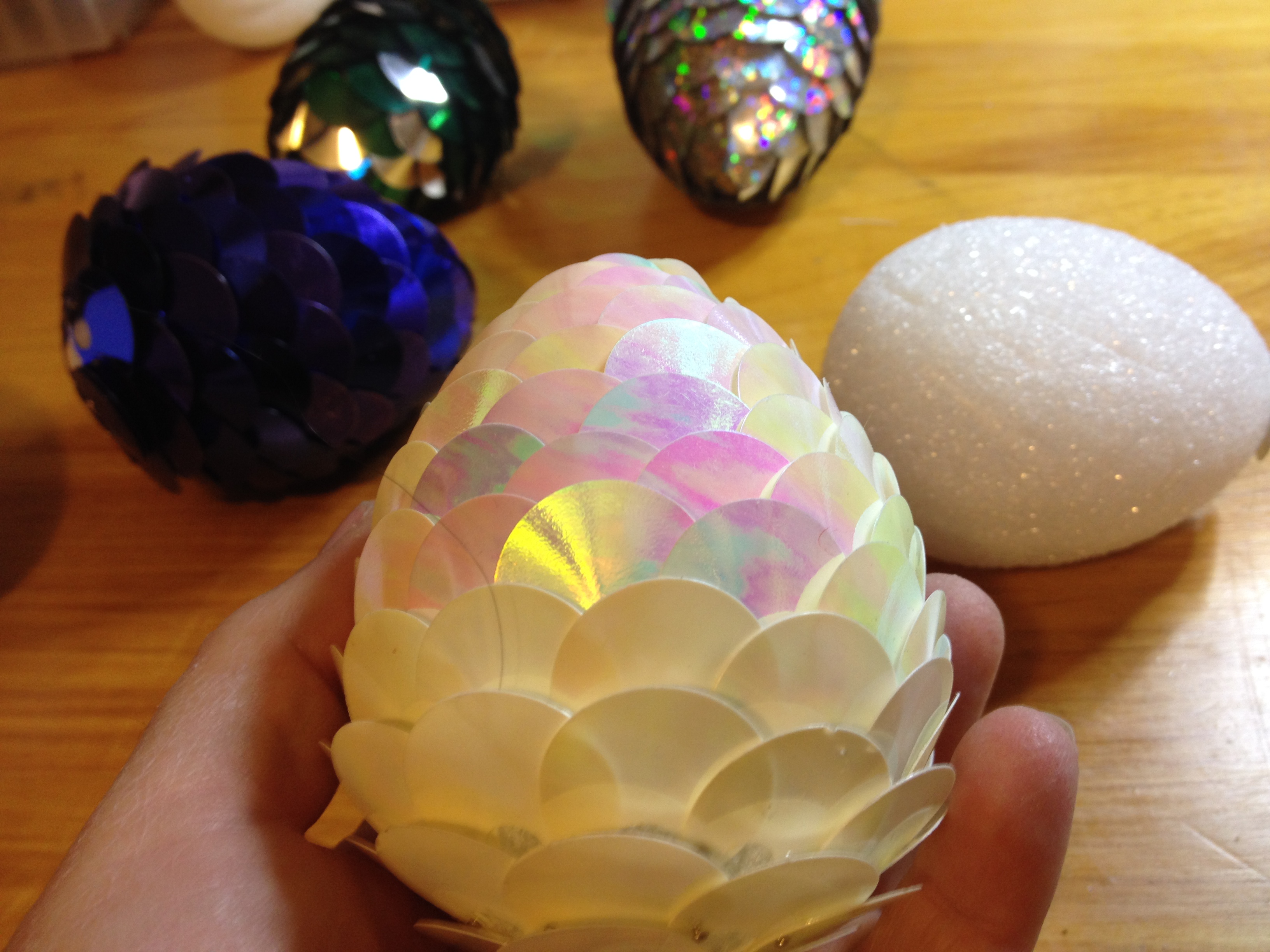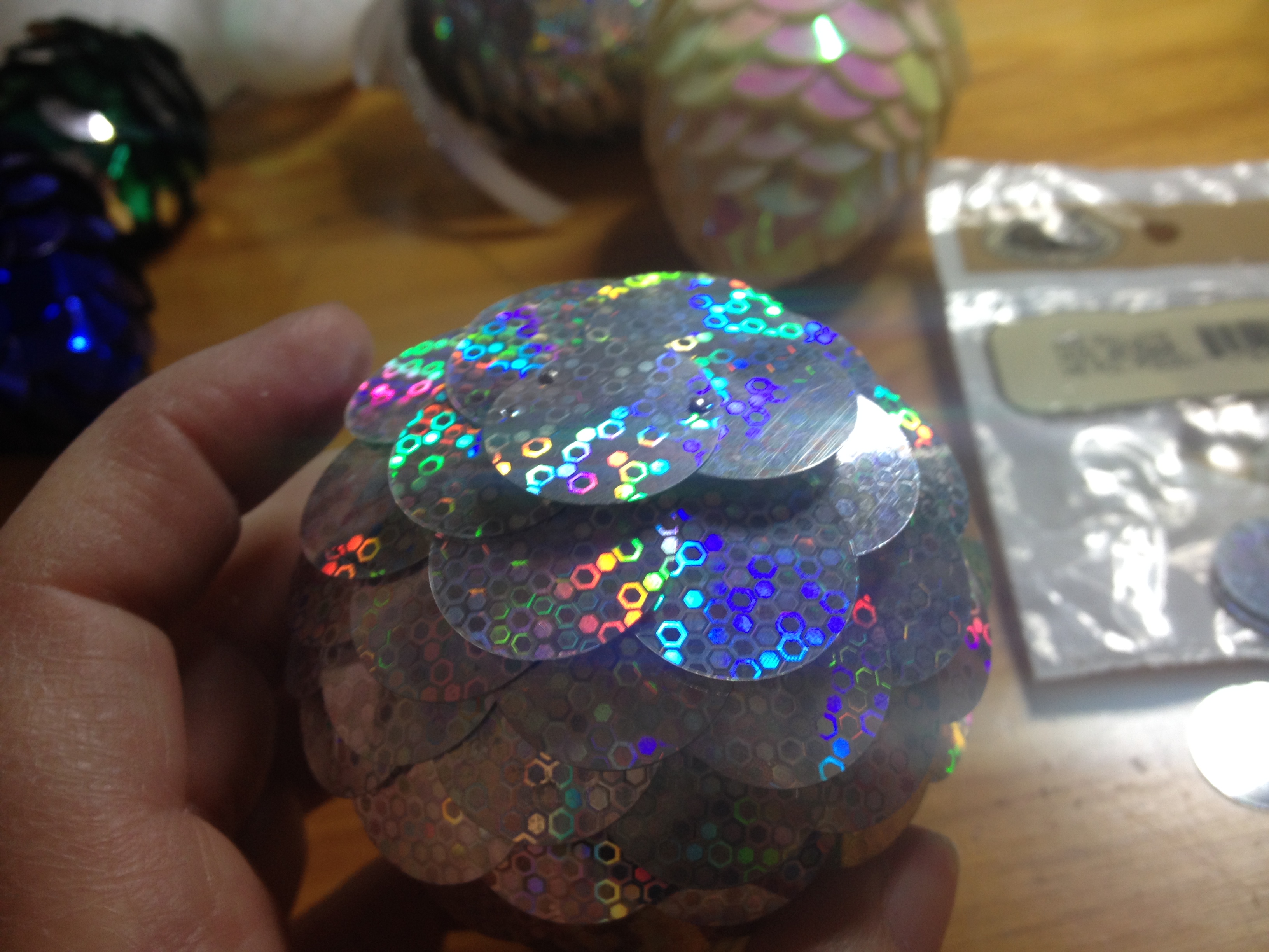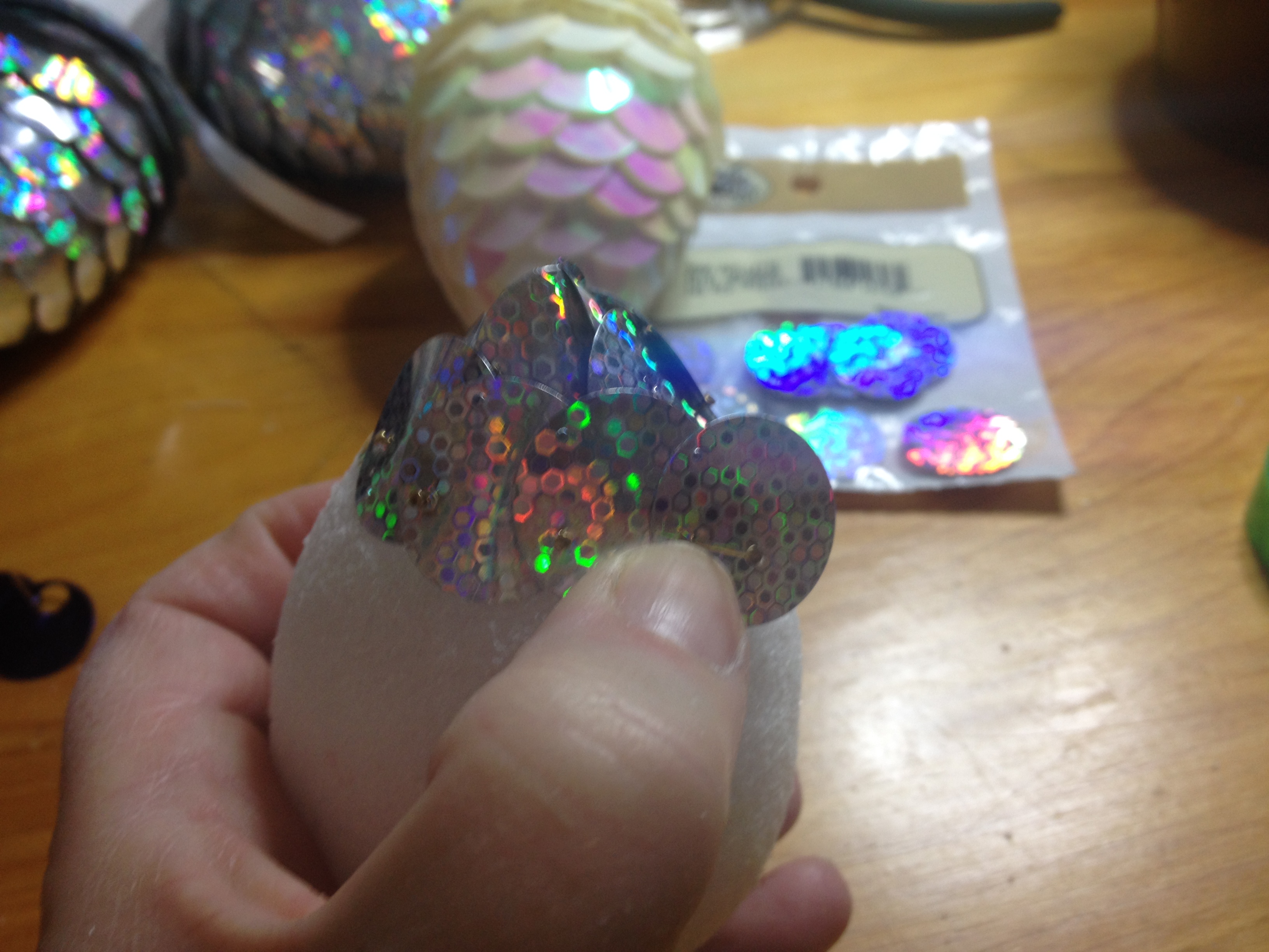 The start is the toughest part. Take the first 3 sequins (paillettes)  bend and overlap these into a cone shape, and secure to the pointy end of the styrofoam egg. Make sure the tip is closed, you don’t want to be able to see the styrofoam through a hole.  I used longer straight pins and a small bit of glue to secure them. Then, start pinning a row halfway below the start working around overlapping each sequin, pinning through both. Kinda like fish scales continuing around in the same direction.