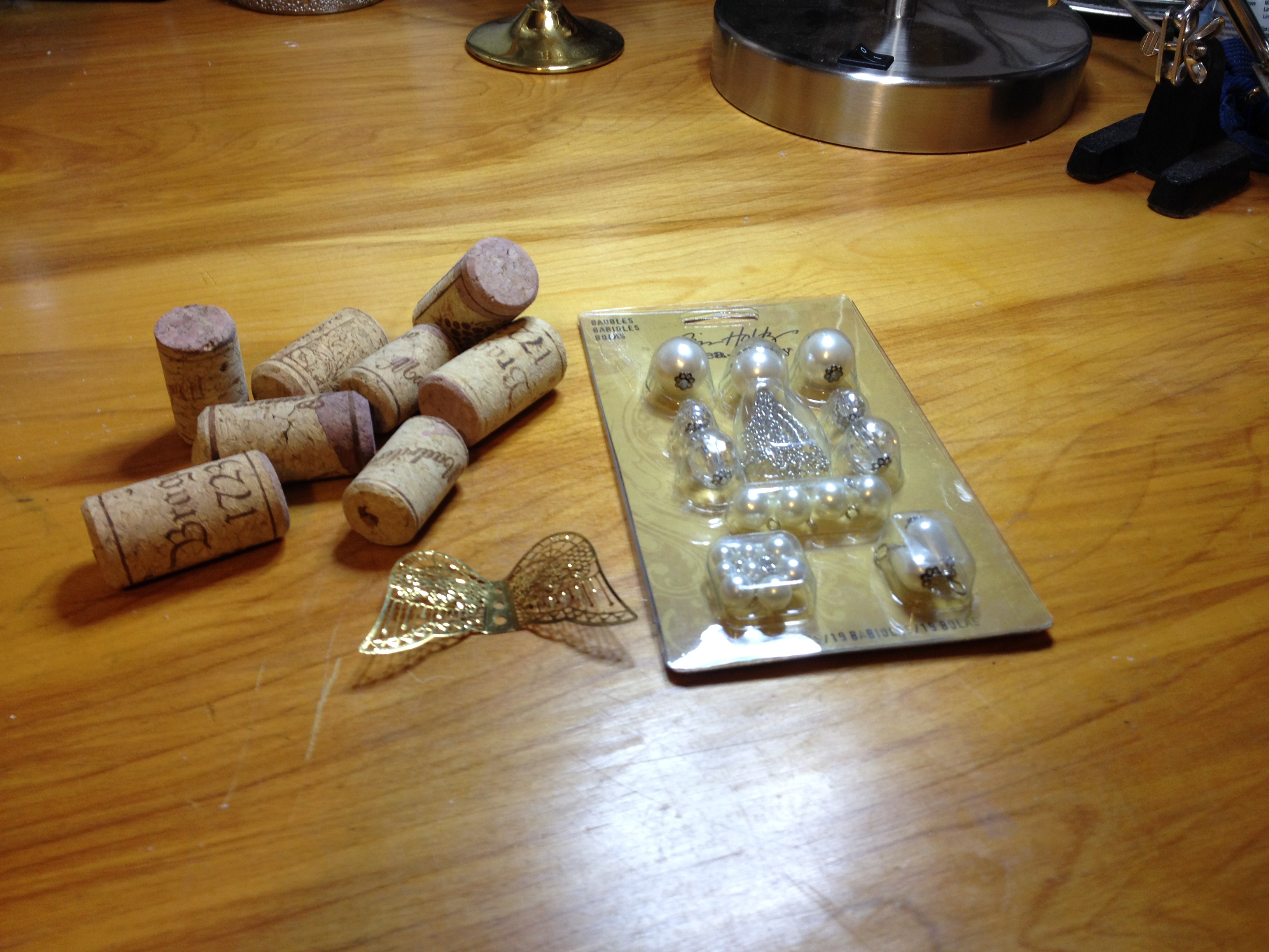 Another eye pin with a tassel on the bottom, some pretty beads on the stem. Push this into the bottom of the cork (centered). You could do multiple strands of beads, chains, seed beads. Use your stash and be creative. I was looking for a vintage, copper and cork combo here.