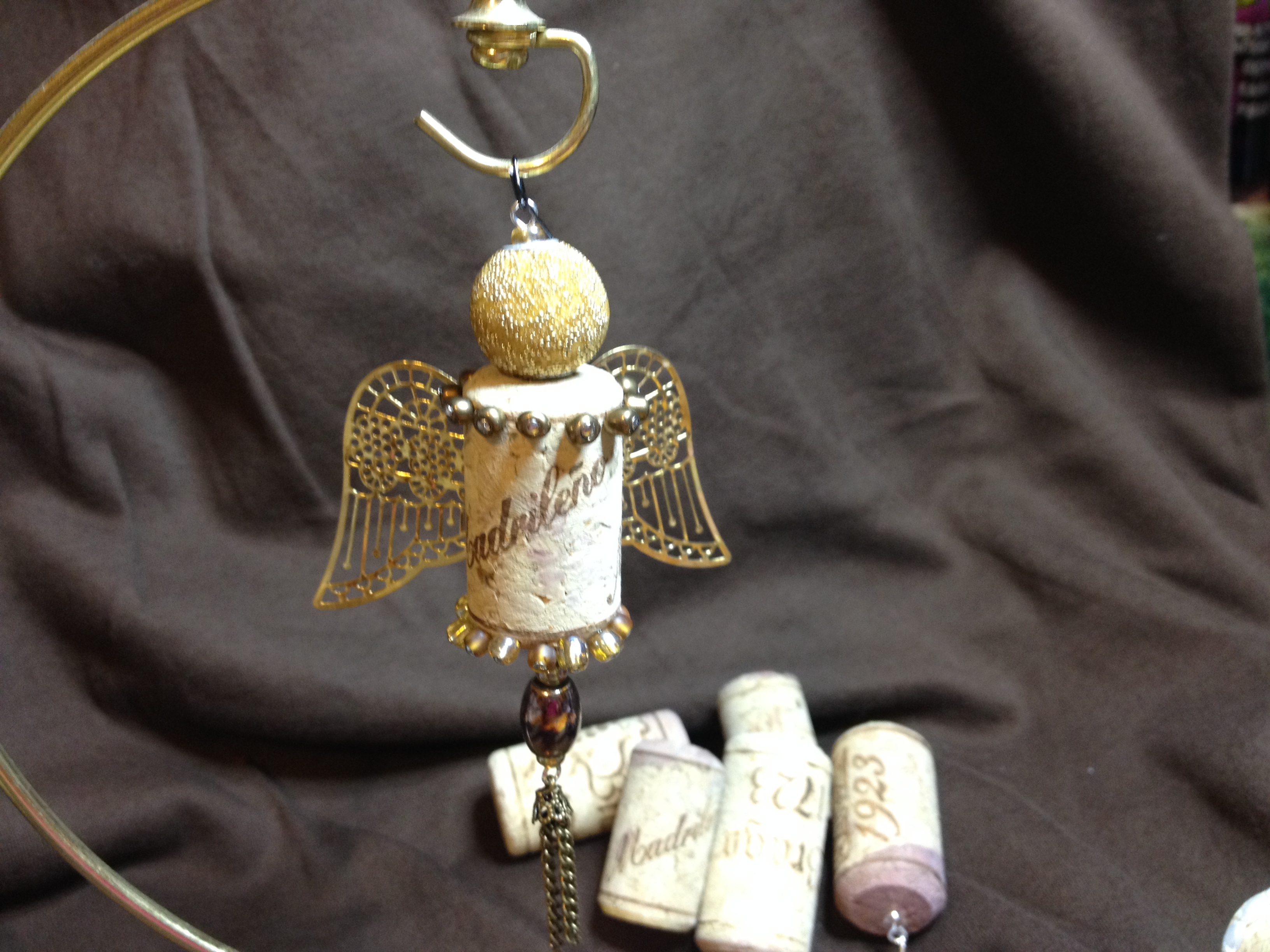 Thought she needed a little more sparkle on her cork, so I added seed beads with sequin pins around the edges (top and bottom) of the cork. I did have to take off her wings, should have done this step earlier. Live and Learn! That’s the beauty of doing it yourself. You can add/subtract, take it apart and put it all back together again until it looks the way you like.