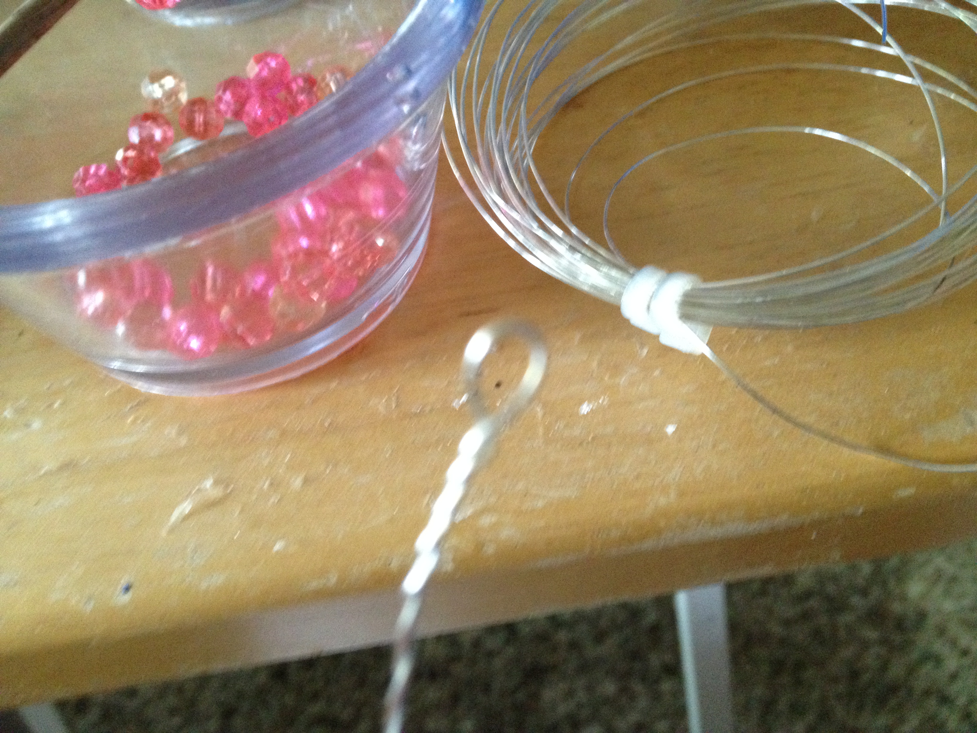 Start with 4 pieces of beading wire 6 inches long. These will be the legs. Bend a small circle at the end, put beads on until you have 2 1/2″ filled, bend a loop in wire, this will be the center loop. Bead the reverse of what you did, to do the other leg and end with another circle.