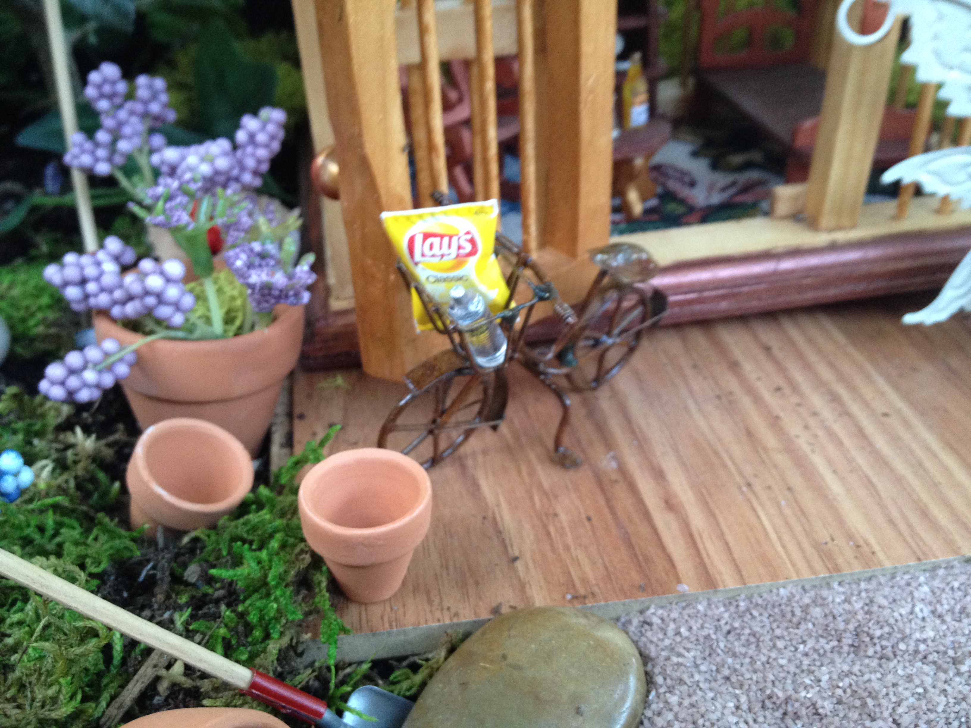 Flooring is next, since there was a kitchen and bath, of course I tiled it! After doing projects on our real homestead, I consider myself a self-taught expert! I had leftover tiny hexagon tiles and added 2 sheets matching tile with black tiles (looked like flowers to me) I still had adhesive and silver sparkly grout leftover from the wishing well project, so it really only cost $6 bucks for tile. ‘