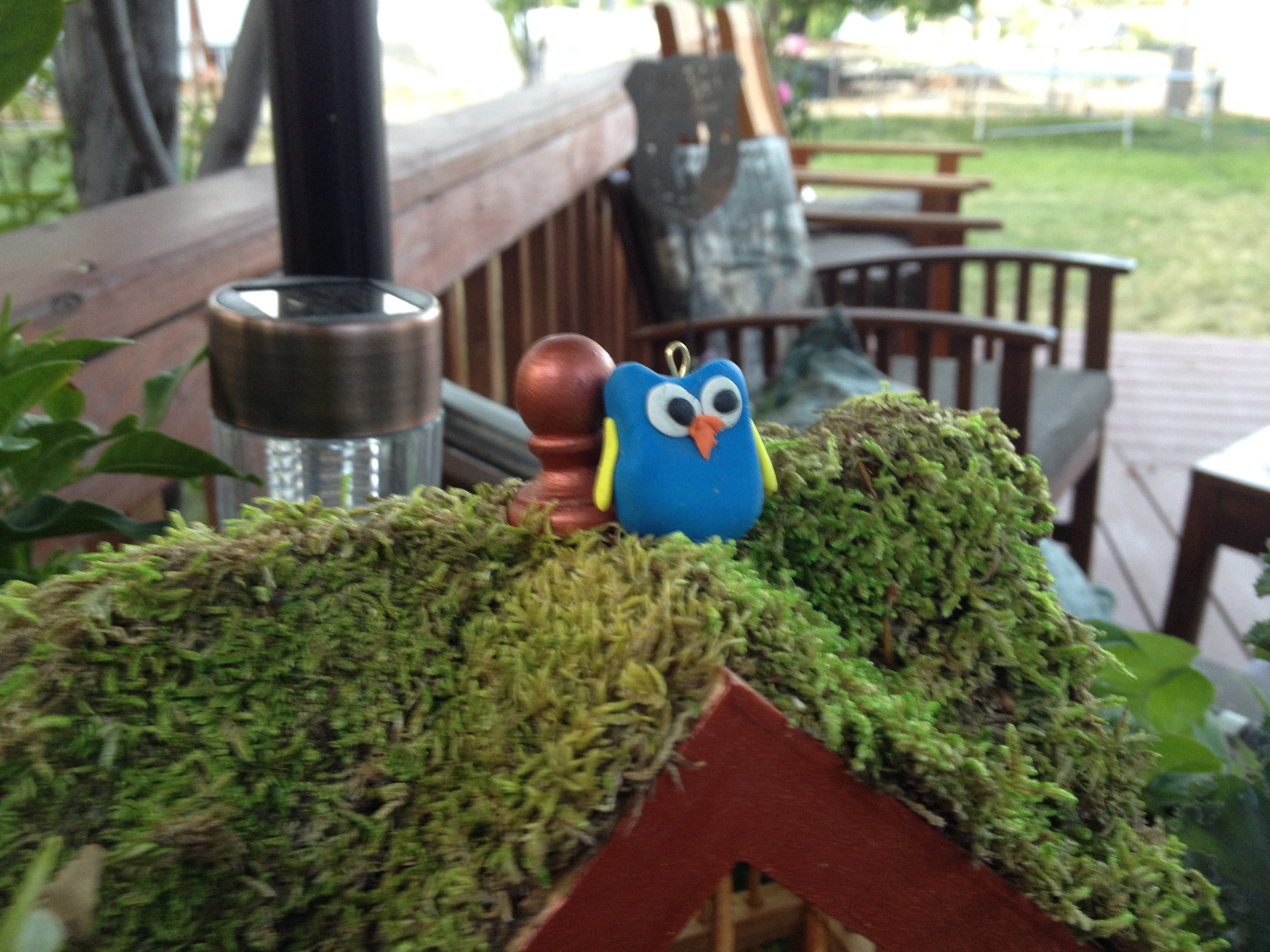 It’s not complete unless the patio is covered. Lowes kindly donated a scrap of Astroturf so she can relax with her shoes off. (all I had to do was ask!) Decided to do a more substantial railing. Since I was using black as an accent, decided to try it on the top rail. Used the same molding I had put on the corners of the house, but painted it gloss black
